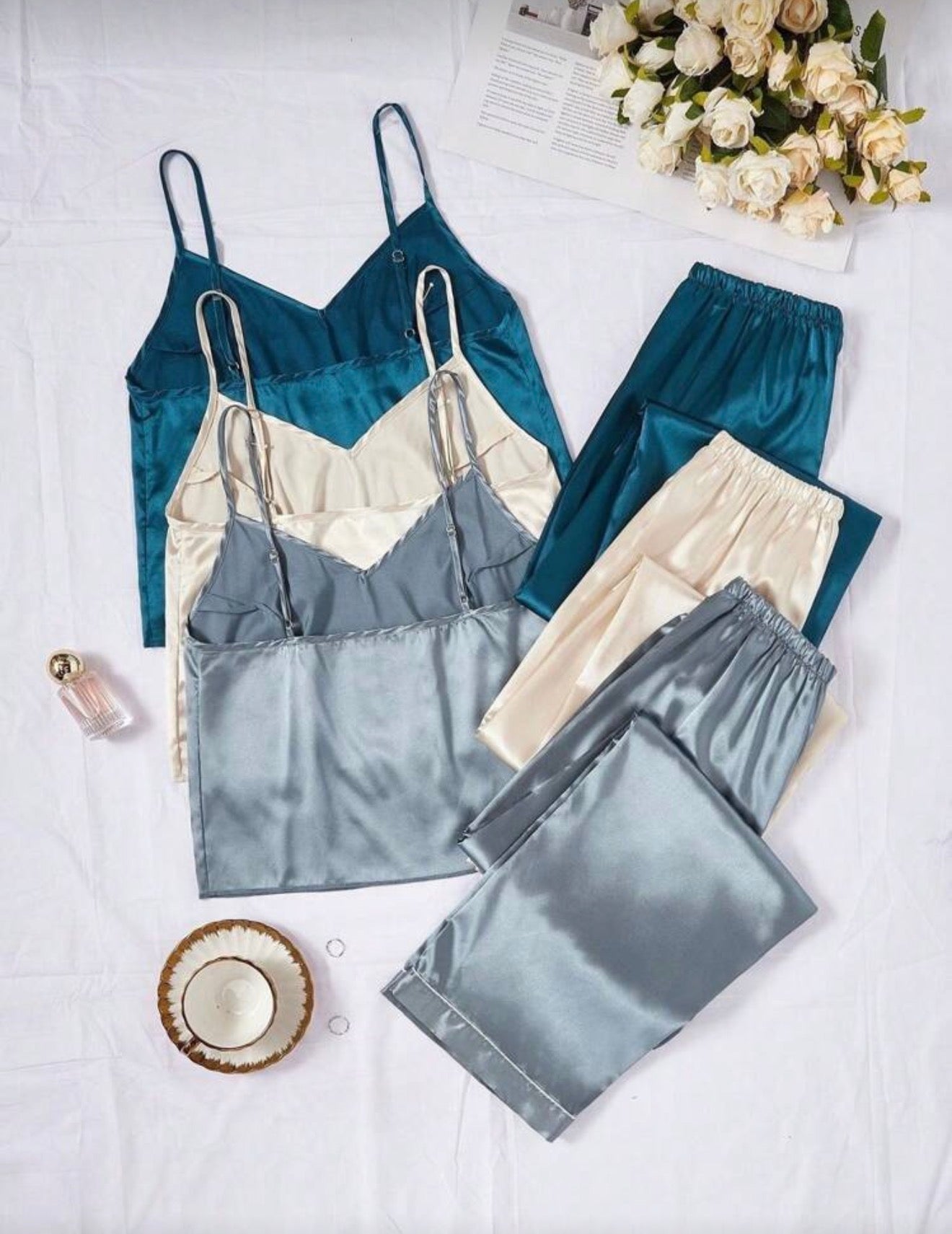 Потопете се в лукс и нежност с сатенения пижамен комплект от 6 части на Vibe Lingerie, създаден за жени, които ценят елегантността и комфорта.